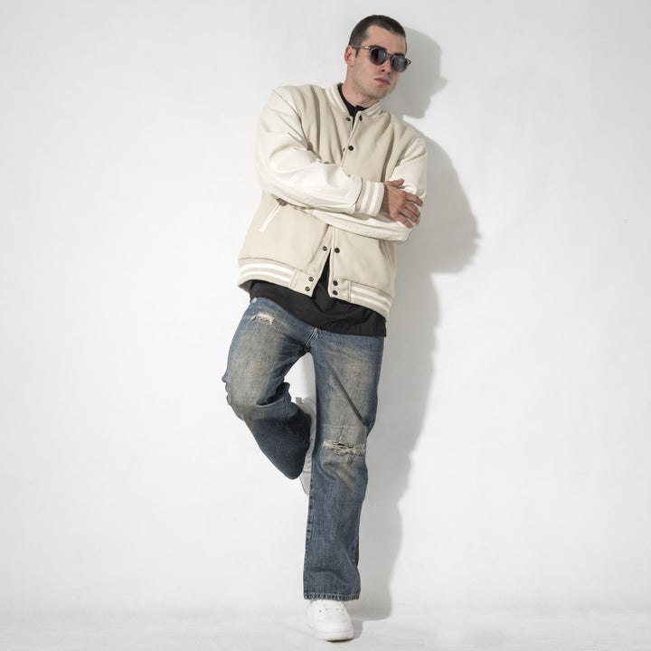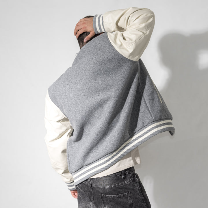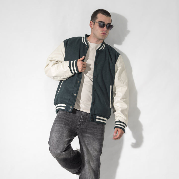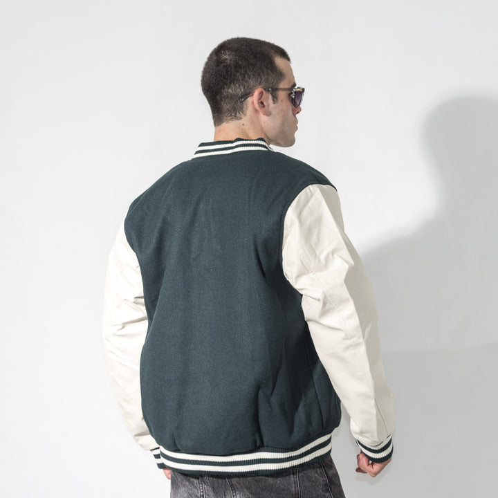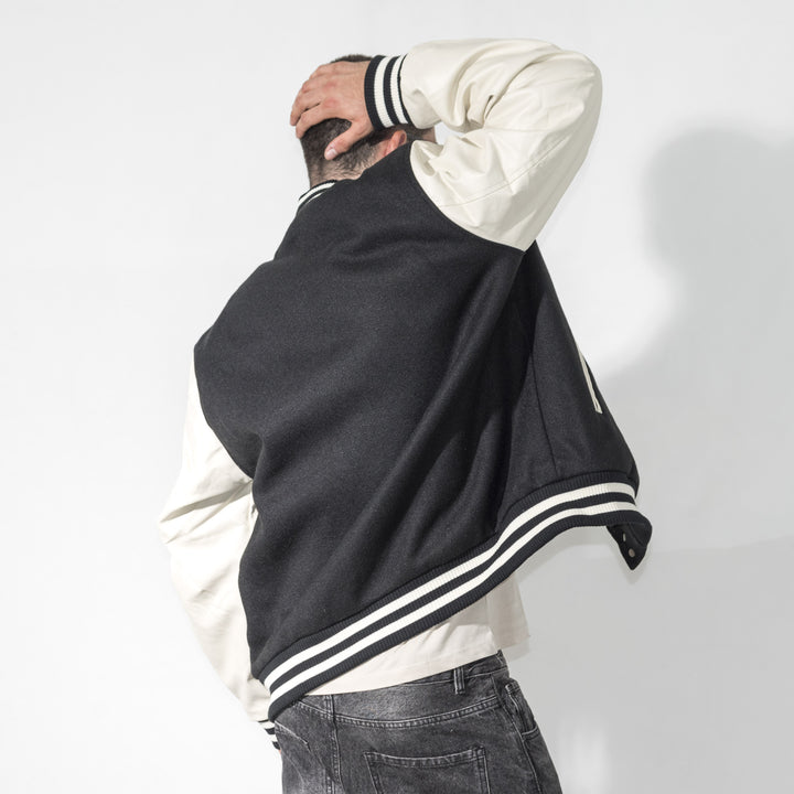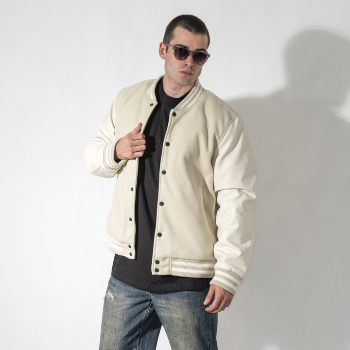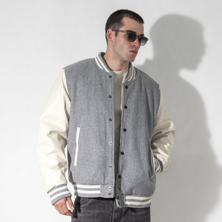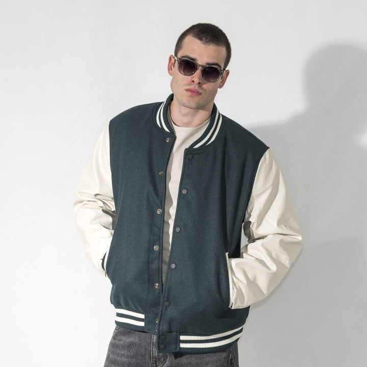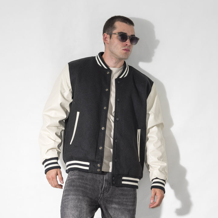 Giubbino modello college con maniche in ecopelle. Chiusura frontale con bottoni automatici, colletto, fondo e fondo manica in tessuto a costine.