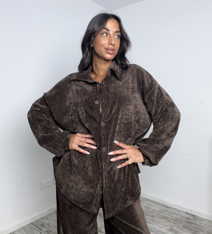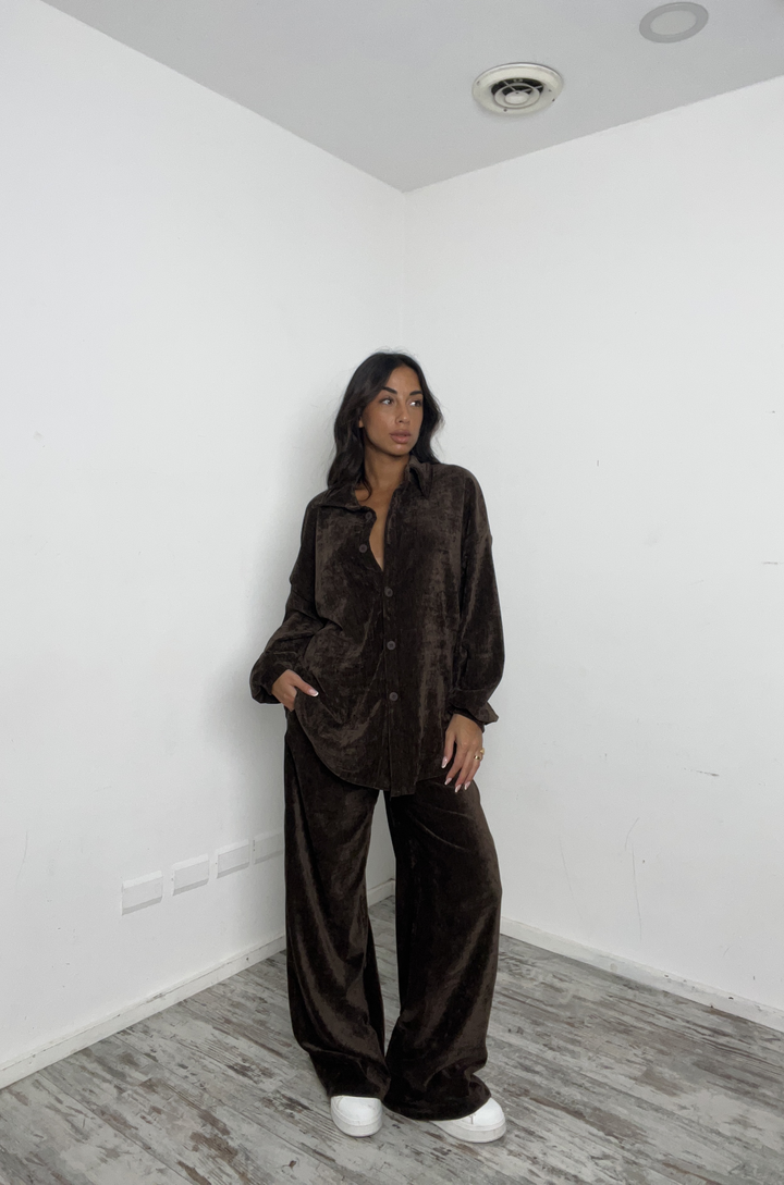 COORDINARO IN VELLUTO, CAMICIA + PANTALONE PALAZZO
